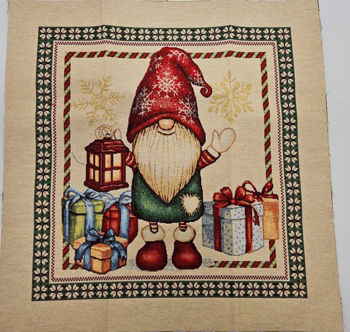 Gobeline Panele "Gnom mit Laterne" beiger Grundstoff mit edlem Goldlurex Garn - Gobeline 47x47cm