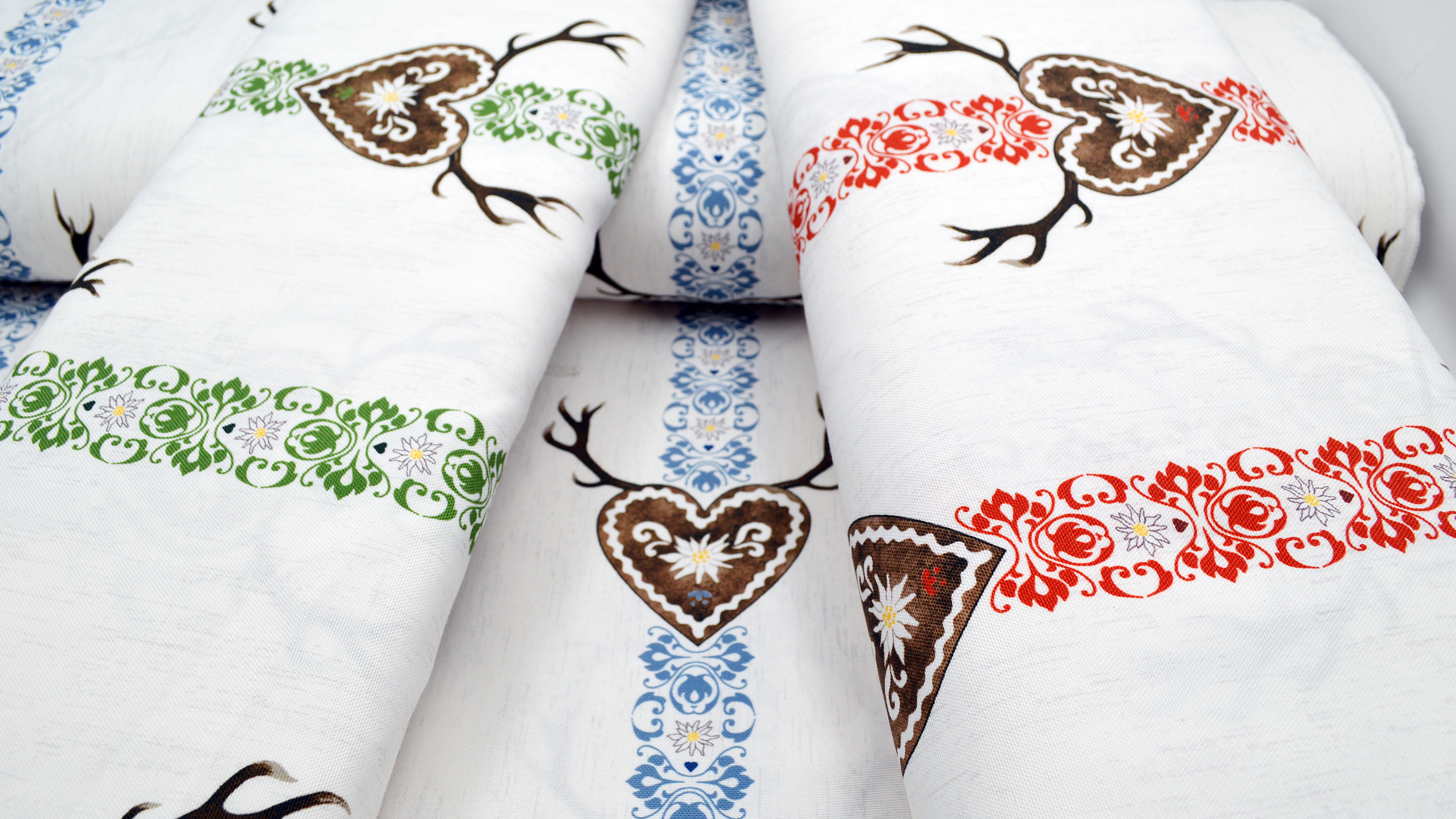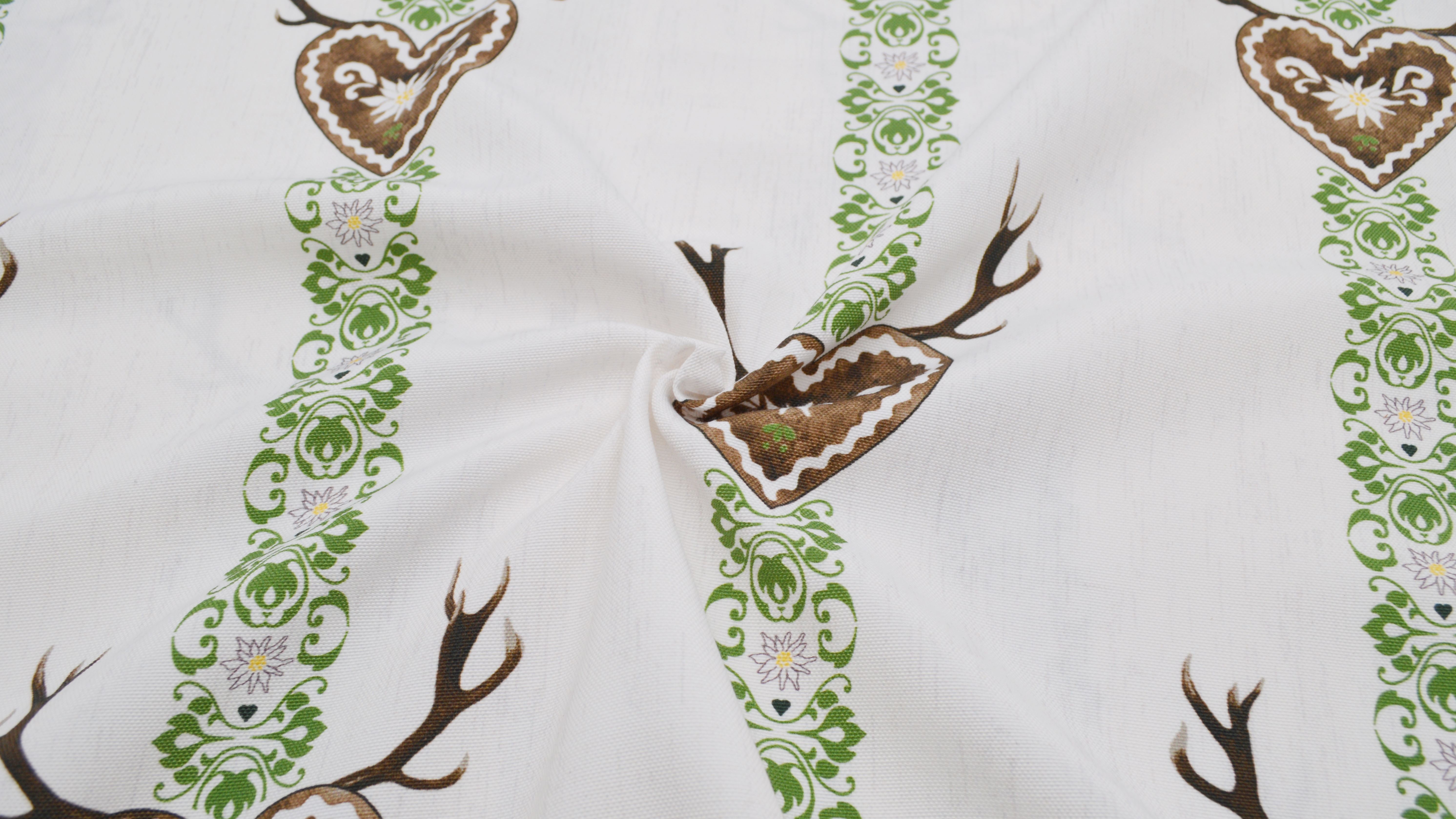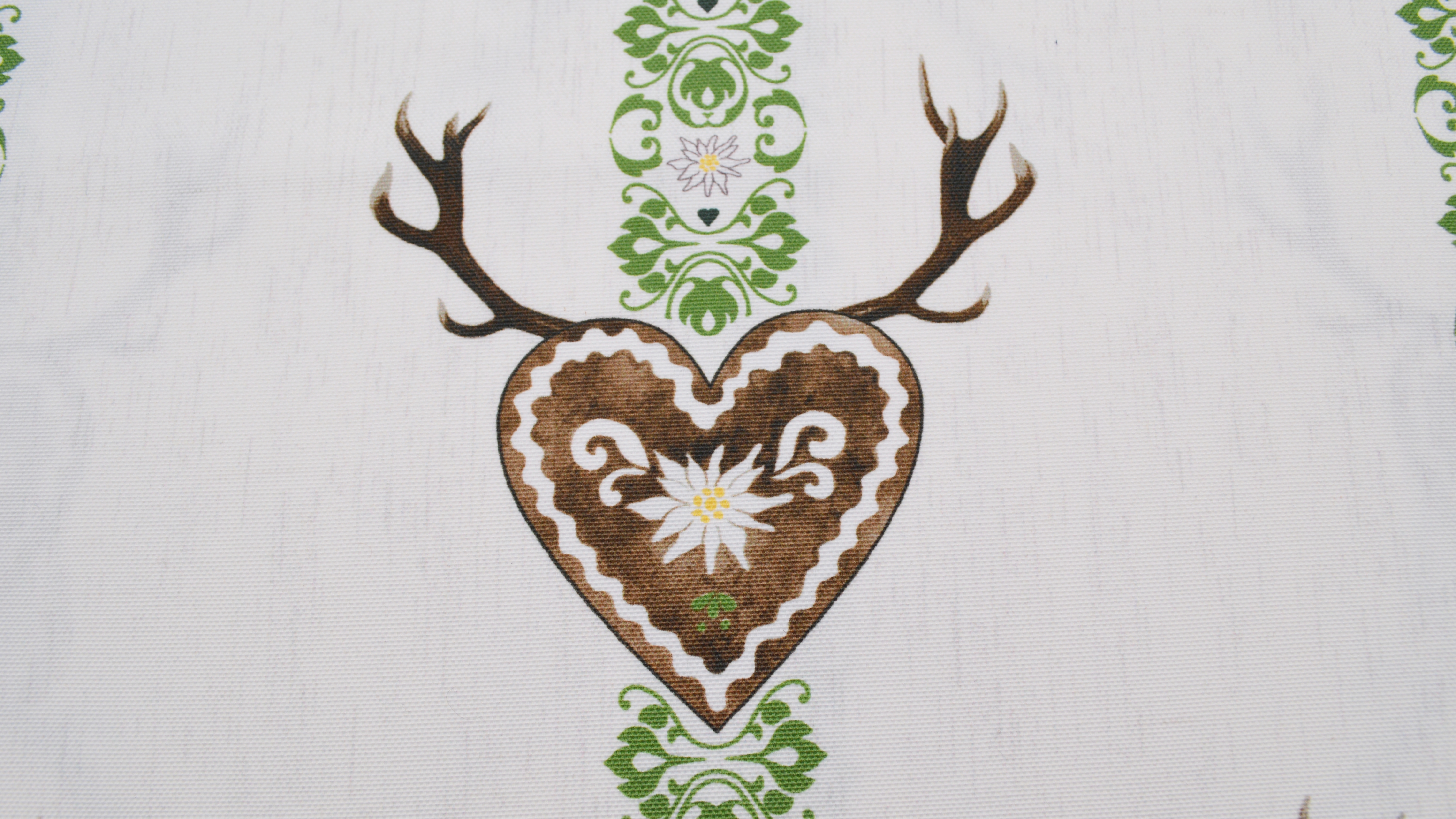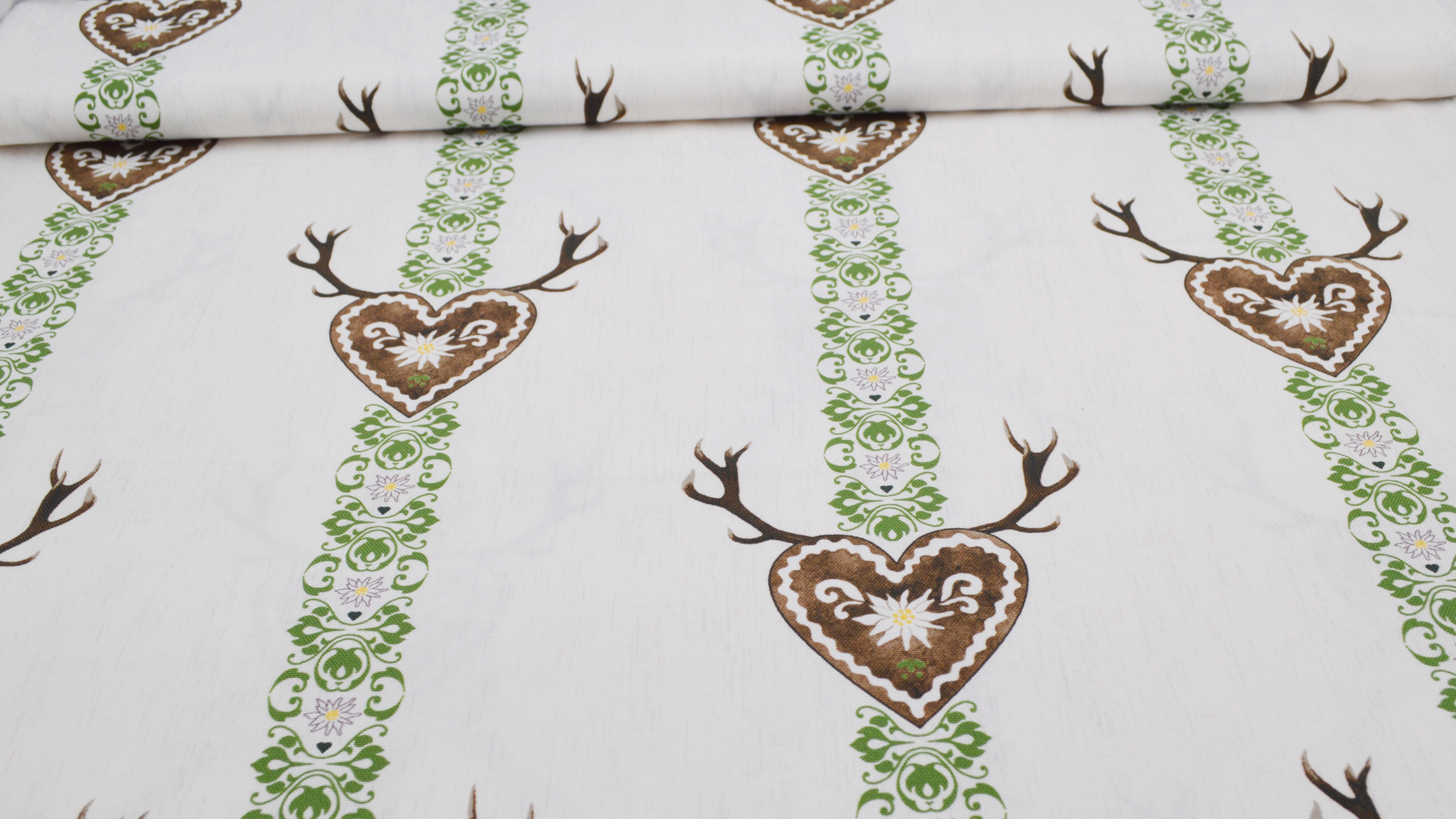 Sie kaufen hier einen hübschen Dekostoff im Landhausstil: begleitet von roten Ornamentborten laufen große Herzen geschmückt mit Hirschgeweih und Edelweiß auf dem lieblich-rustikalen Stoff entlang.