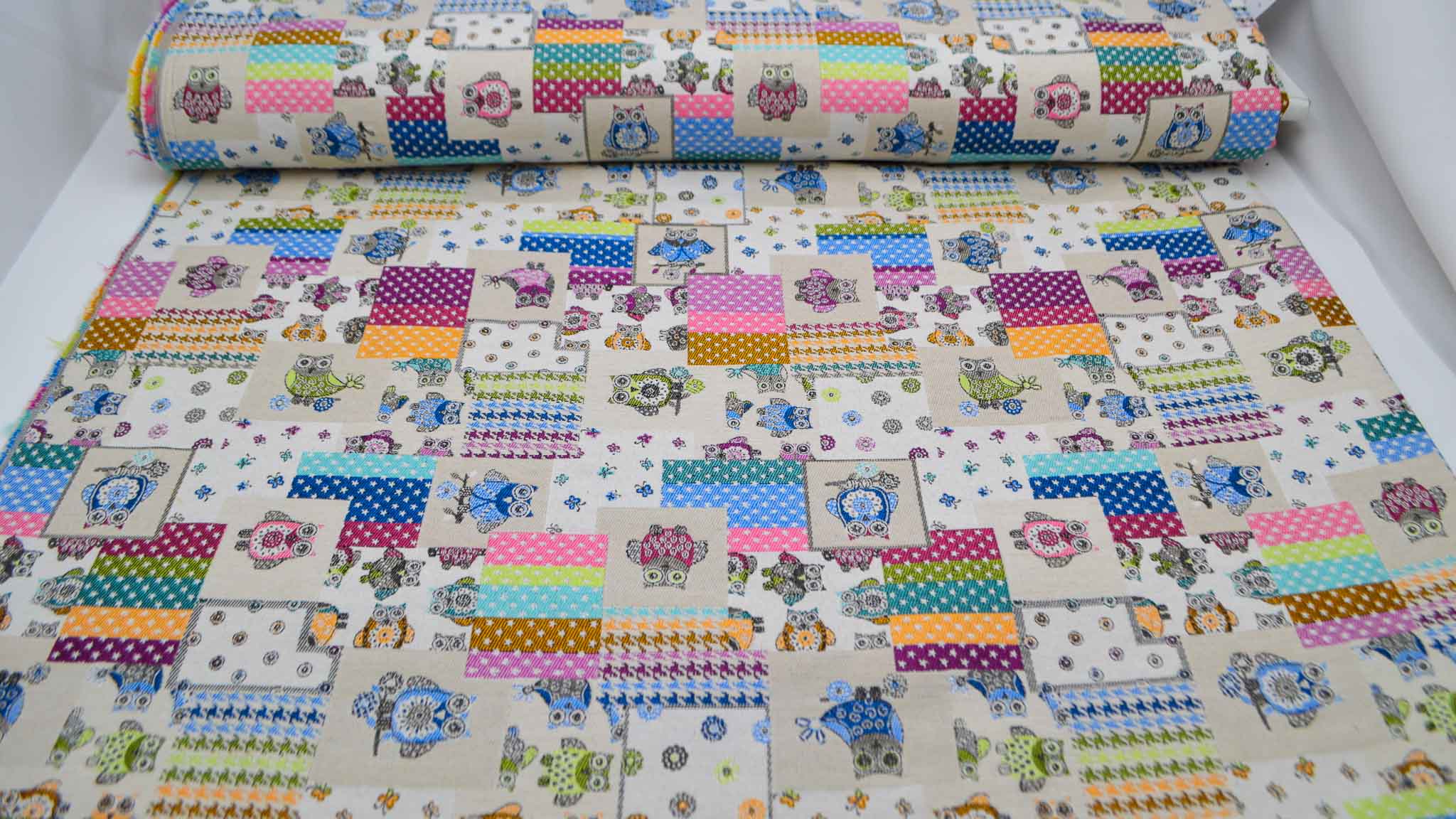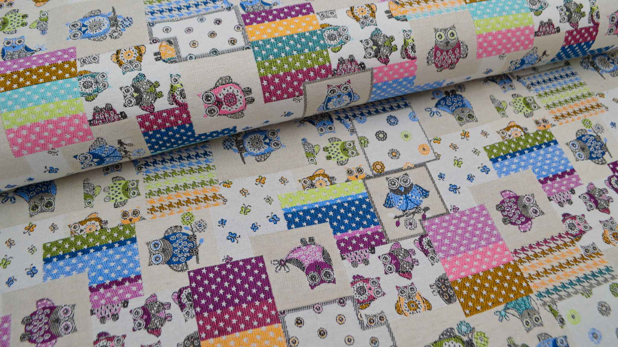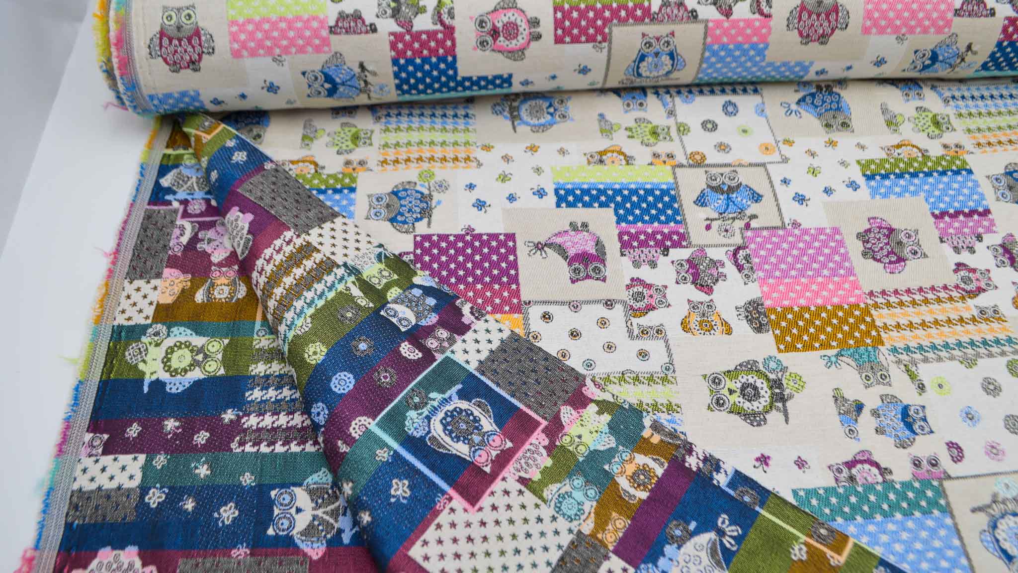 Freundliche Gobelin-Collage mit Eulen, Sternen, Pepita Muster und Schmetterlingen.
