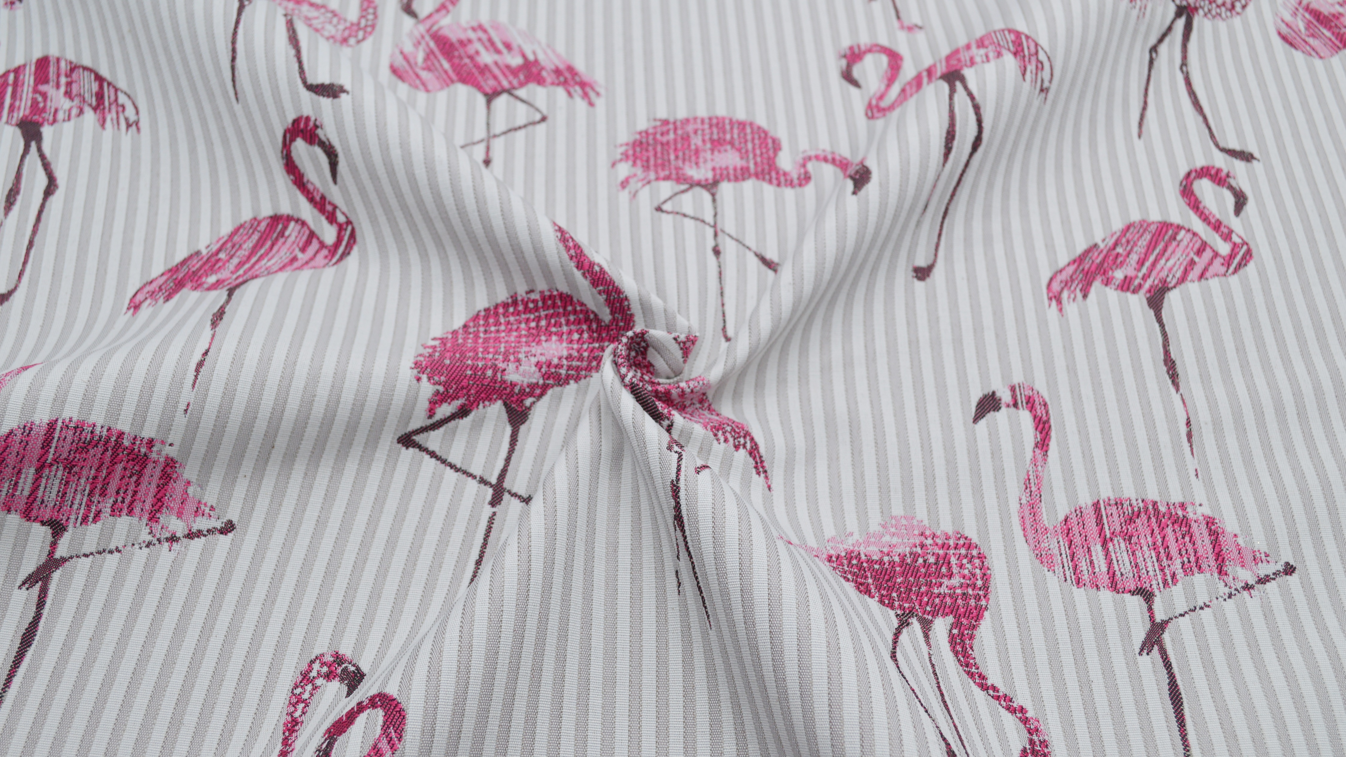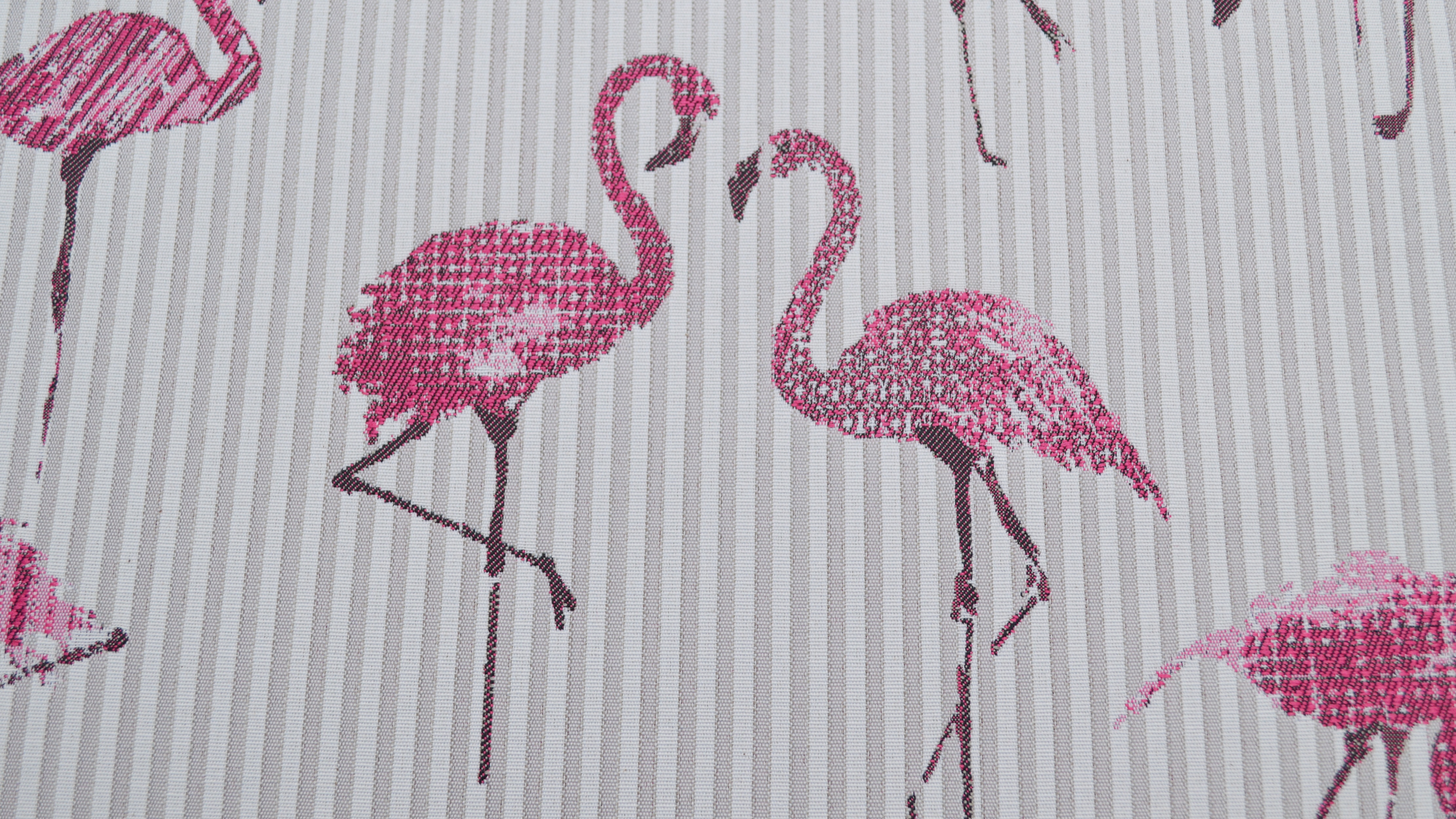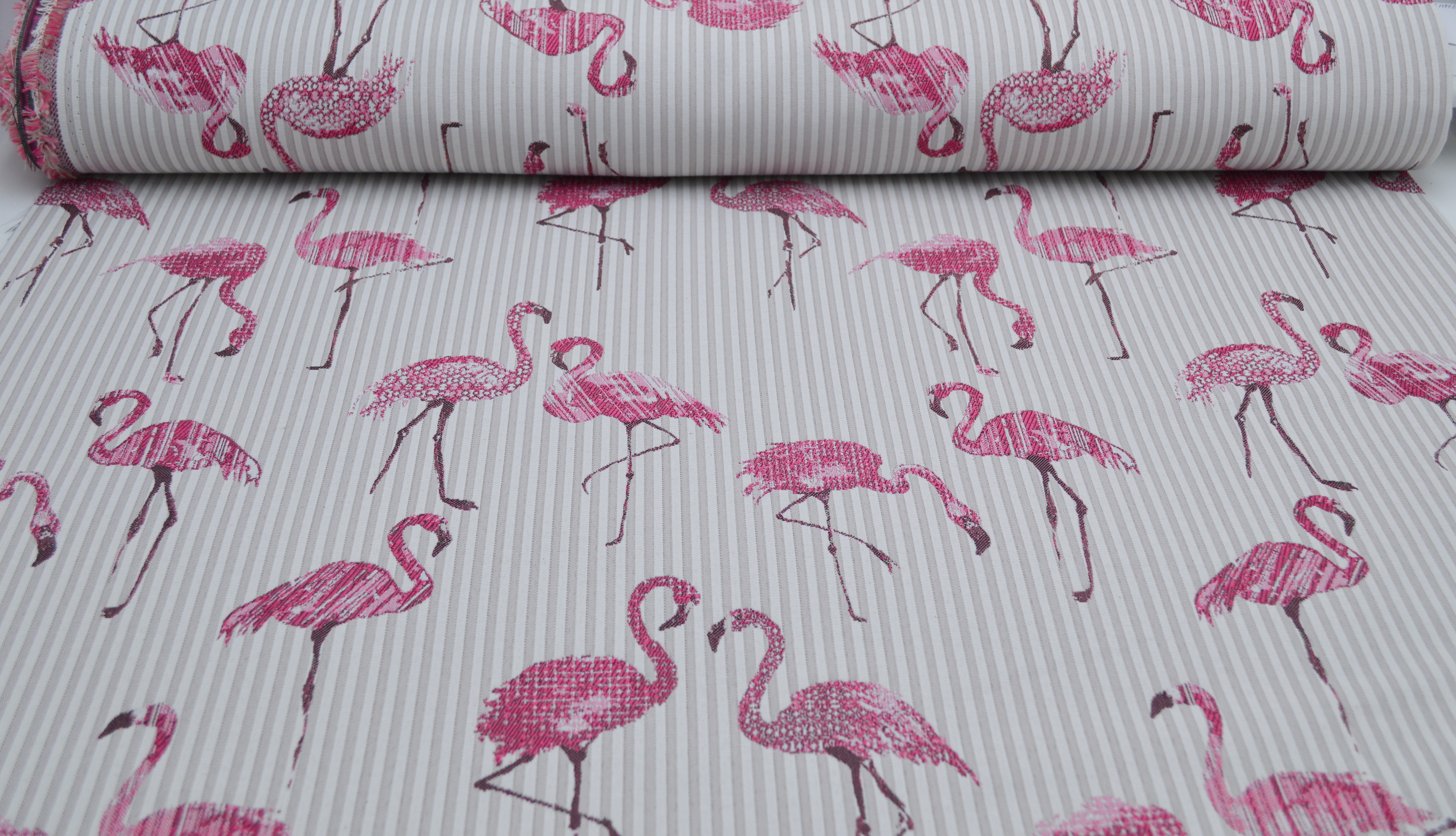Dieser wunderschöne, beidseitig verwendbare Jacquard zeigt liebevolle Flamingopärchen, die mit ihren schlanken Hälsen ein Herz bilden. Vorder- und Rückseite sind dezent gestreift, wobei die Bordeauxseite, im Vergleich zur eher dezent beigen Vorderseite, sehr kräftig wirkt. Die friedlich ruhenden oder grasenden Flamingos eignen sich für großflächige Nähprojekte, wie zum Beispiel Vorhänge oder ähnliches.