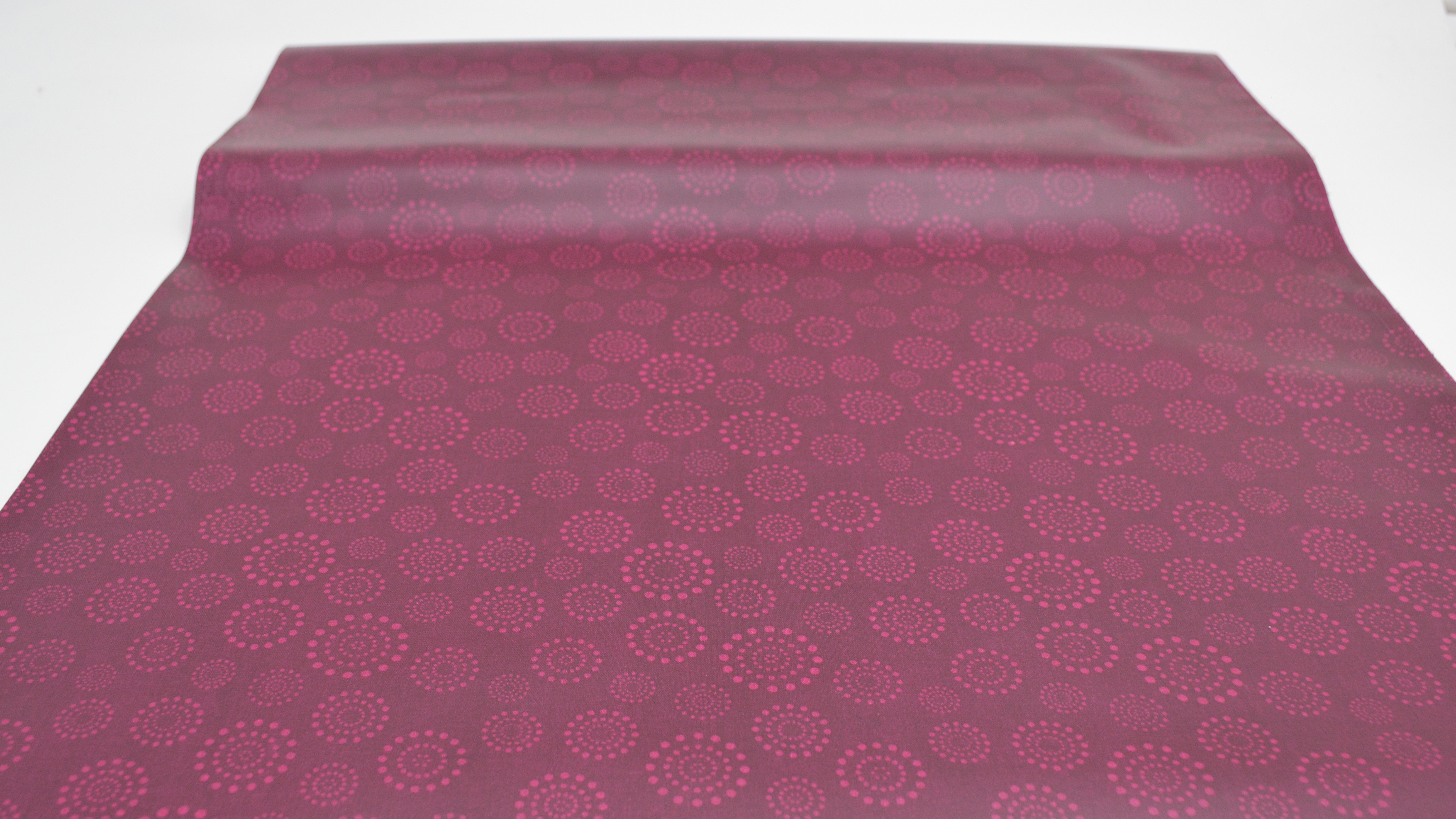 "Punktekreisel" zeigt wie der Name schon sagt, ein Muster, das wellenartige Kreisel aus Punkte hat. Das tiefe violett ist ein Eyecatcher für Kosmetik- und Kulturtaschen, abwaschbare Utensilos oder mutige Tischdecken! Er ist ist matt beschichtet, glänzt somit nicht und lässt sich toll mit den anderen beschichteten Stoffen kombinieren!
