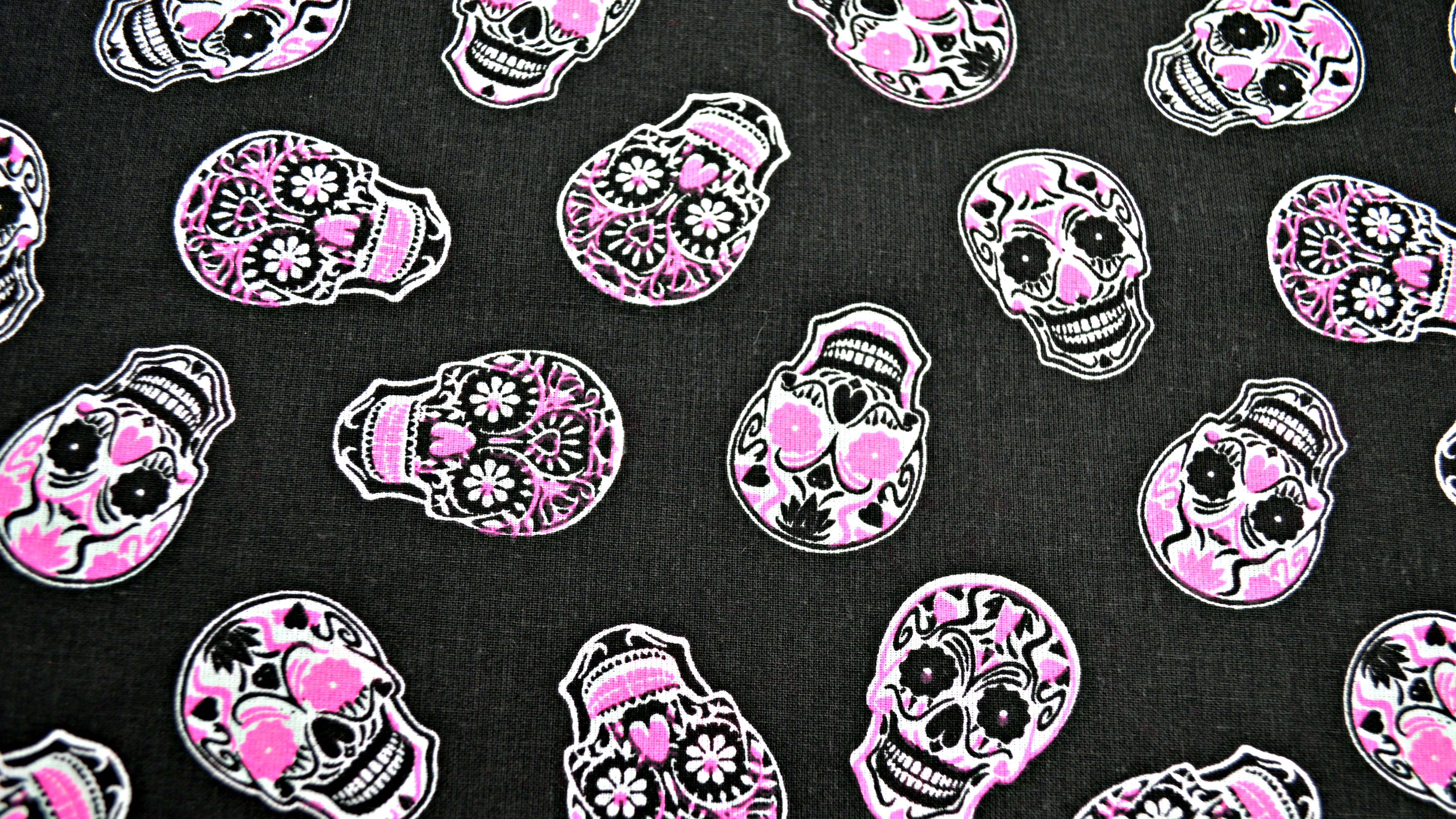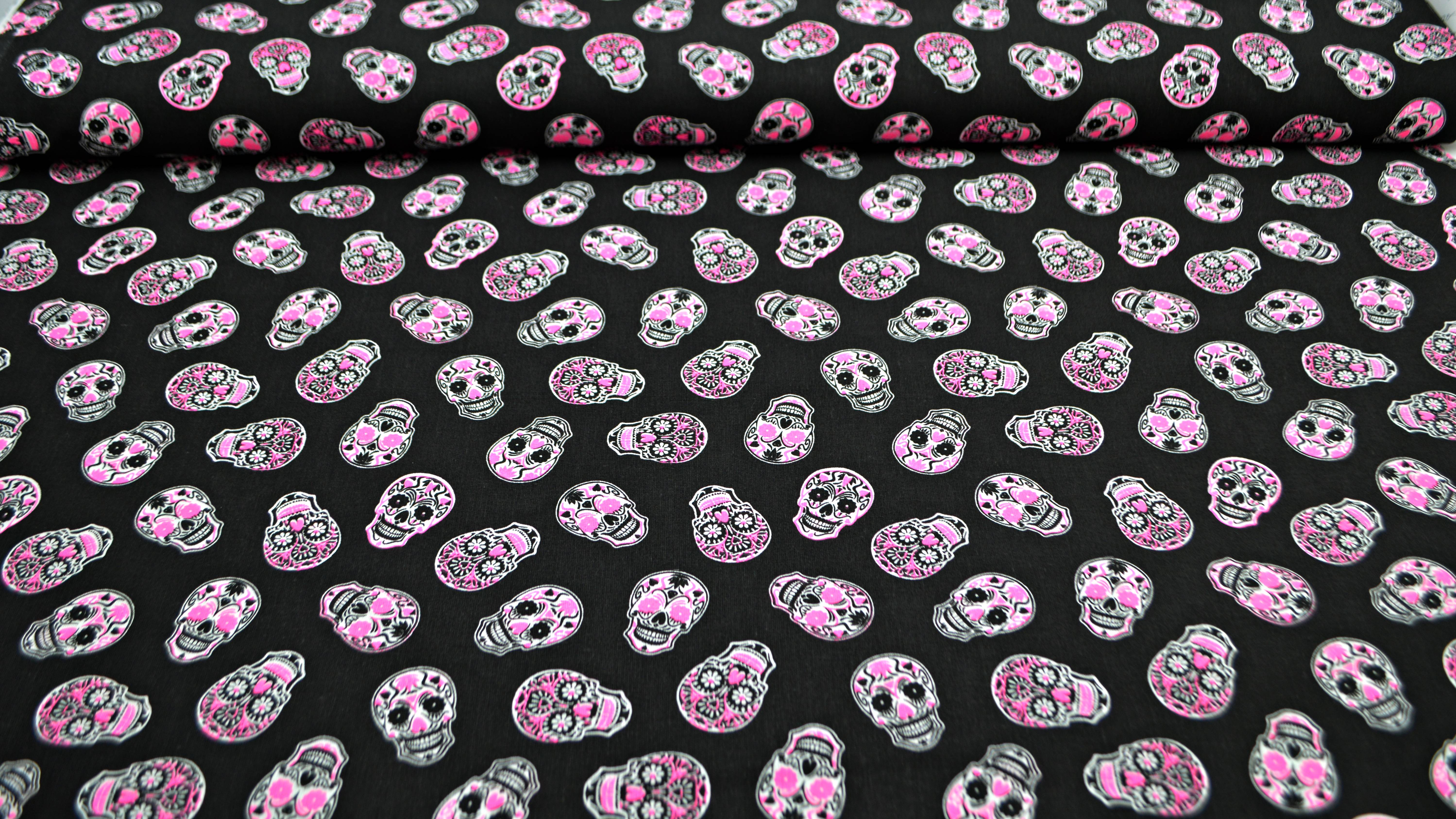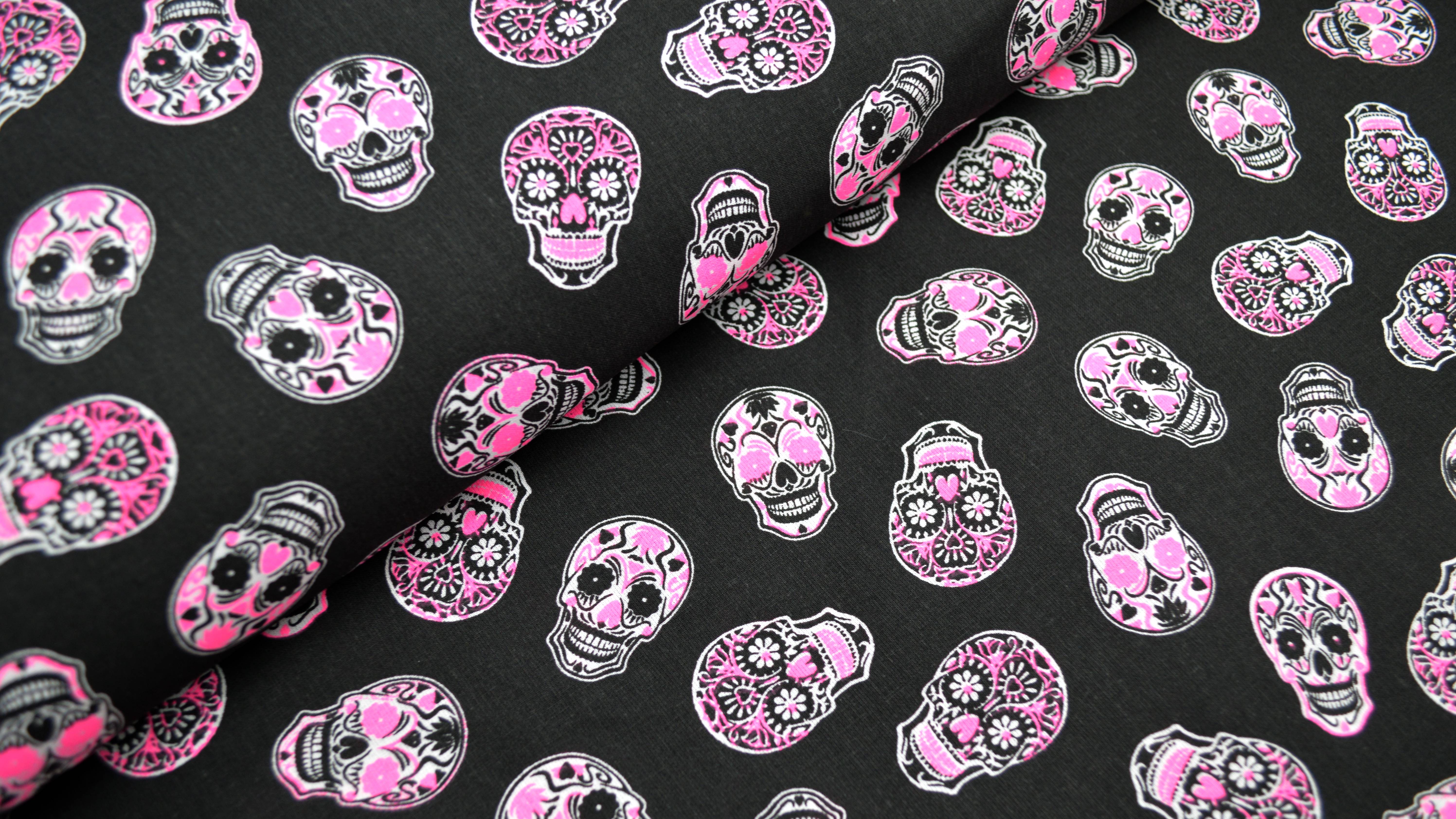 Schwarzer Baumwollstoff mit mexikanischen Totenköpfen, Totenkopfstoff