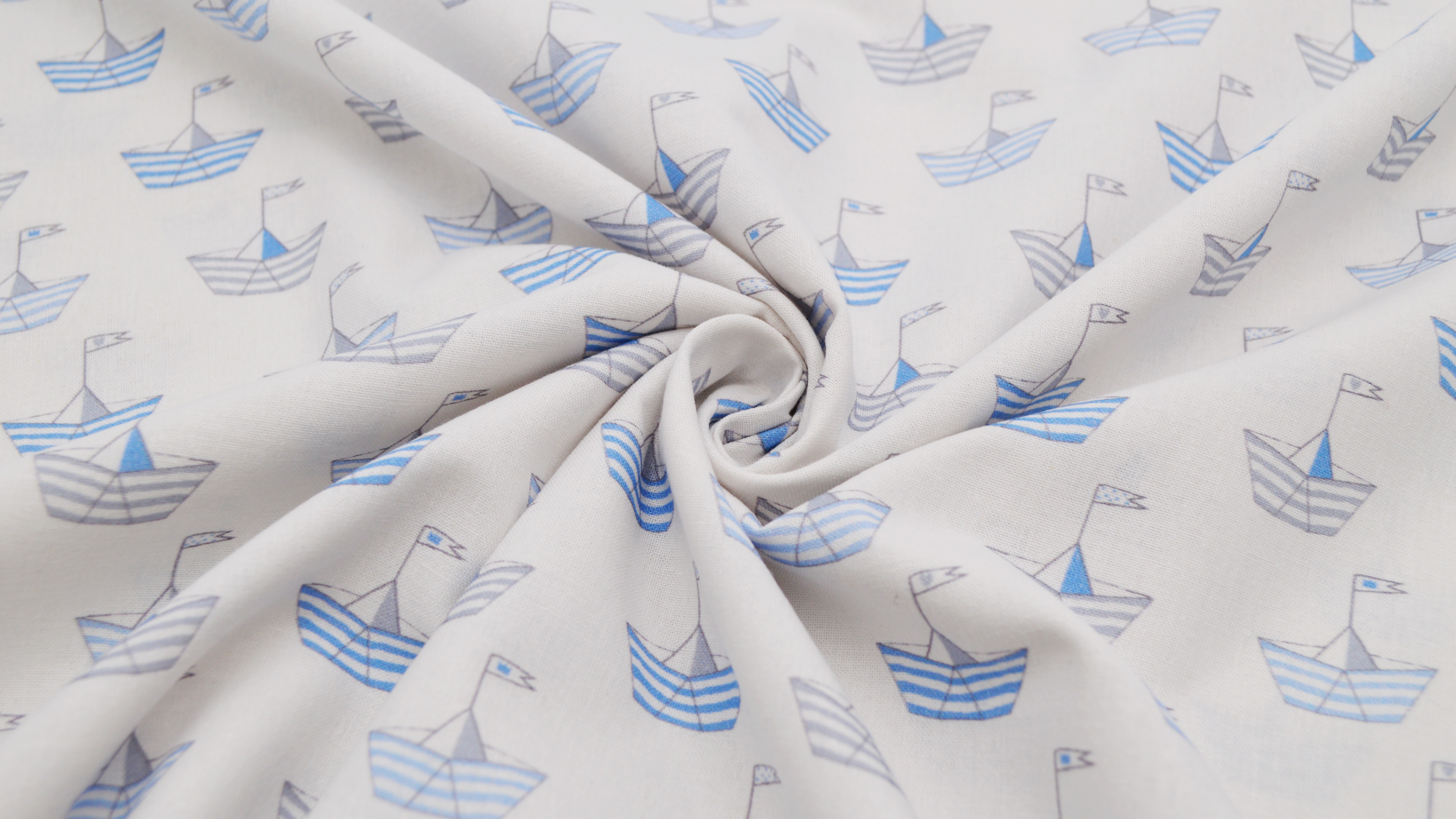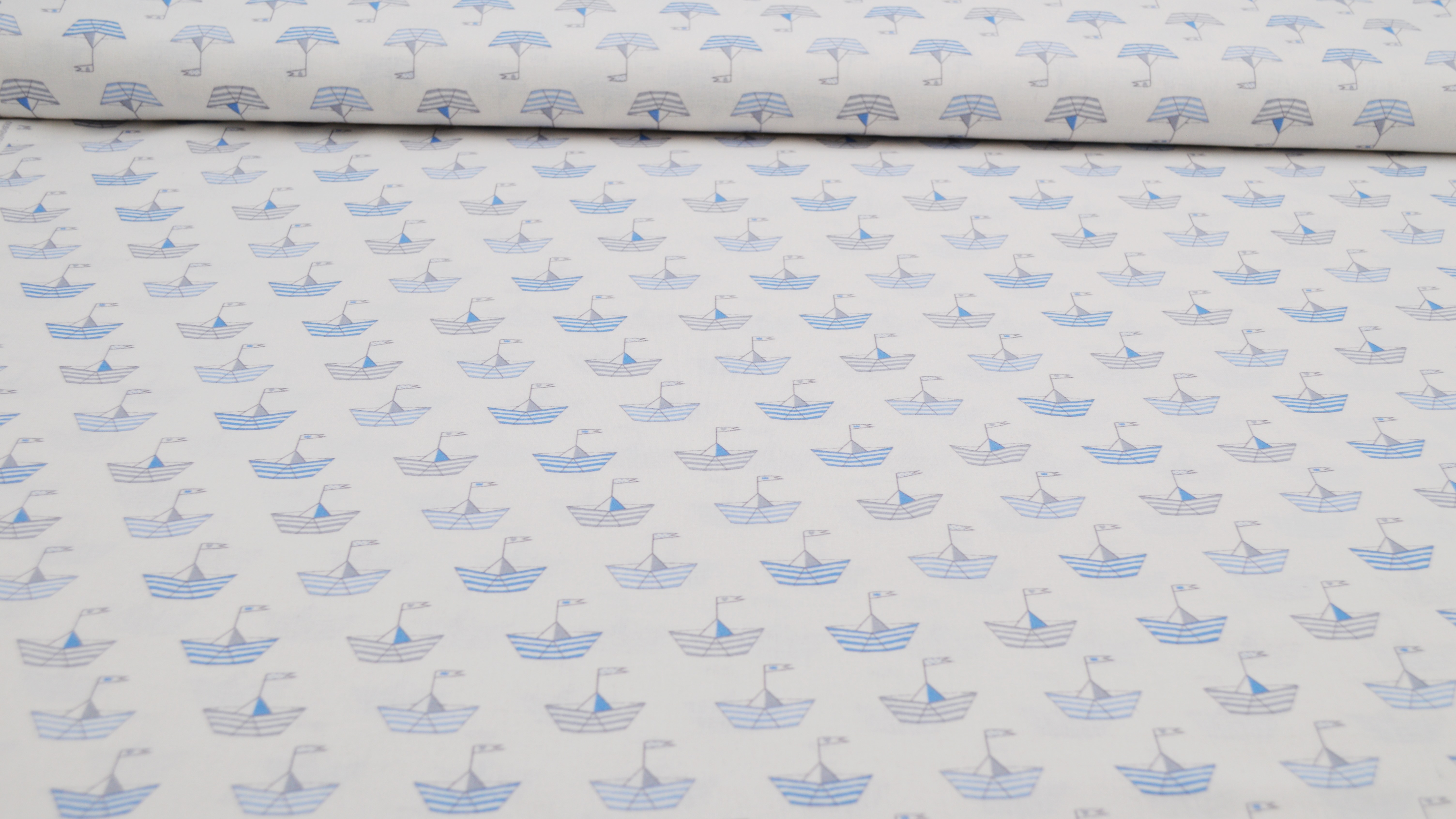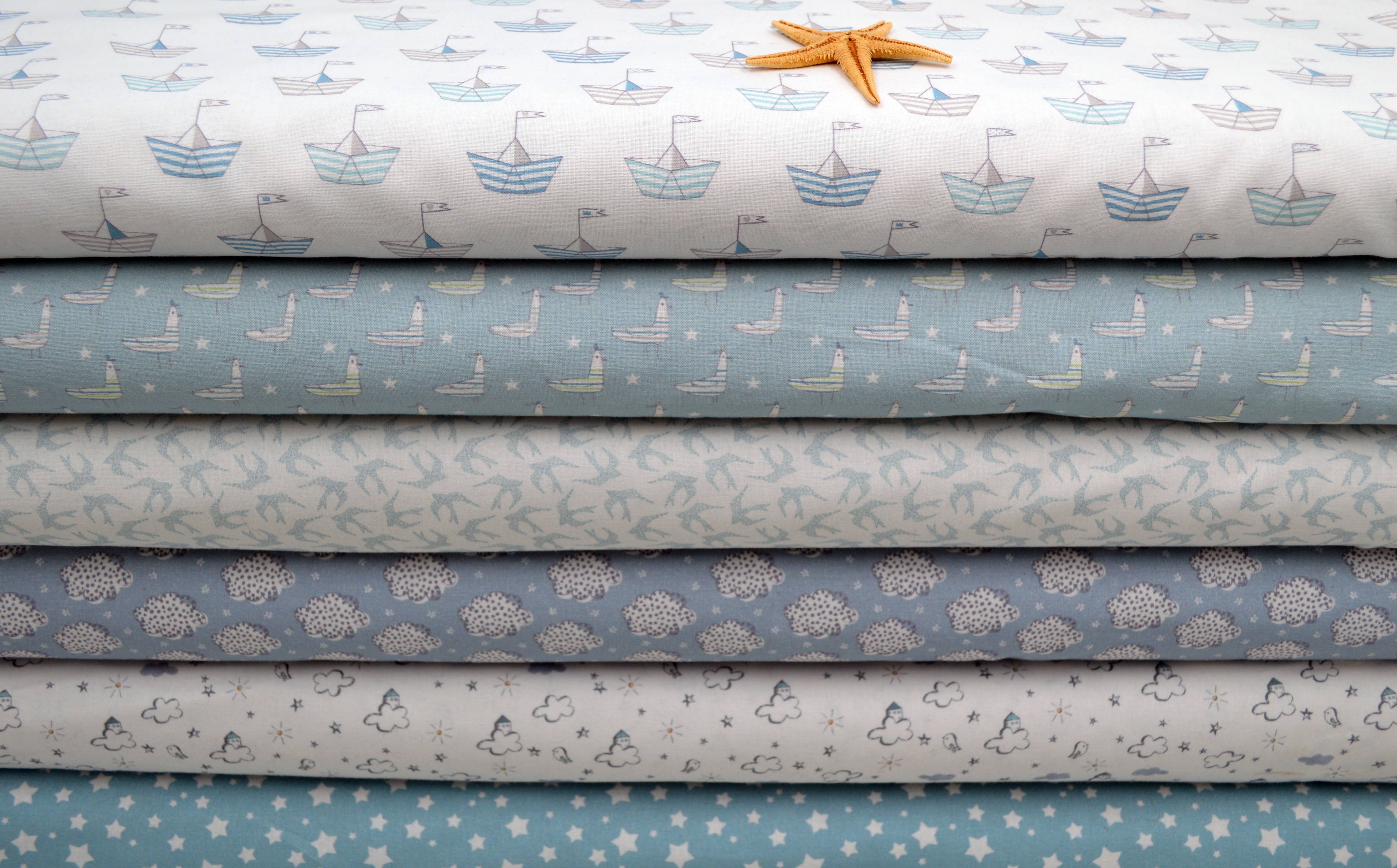Unsere Babyboom-Kollektion besteht aus 7 farblich aufeinander abgestimmten, besonders feinfädigen Baumwollstoffen in pastellig-zarten Blautönen mit hübschen Meer- und Wettermotiven.