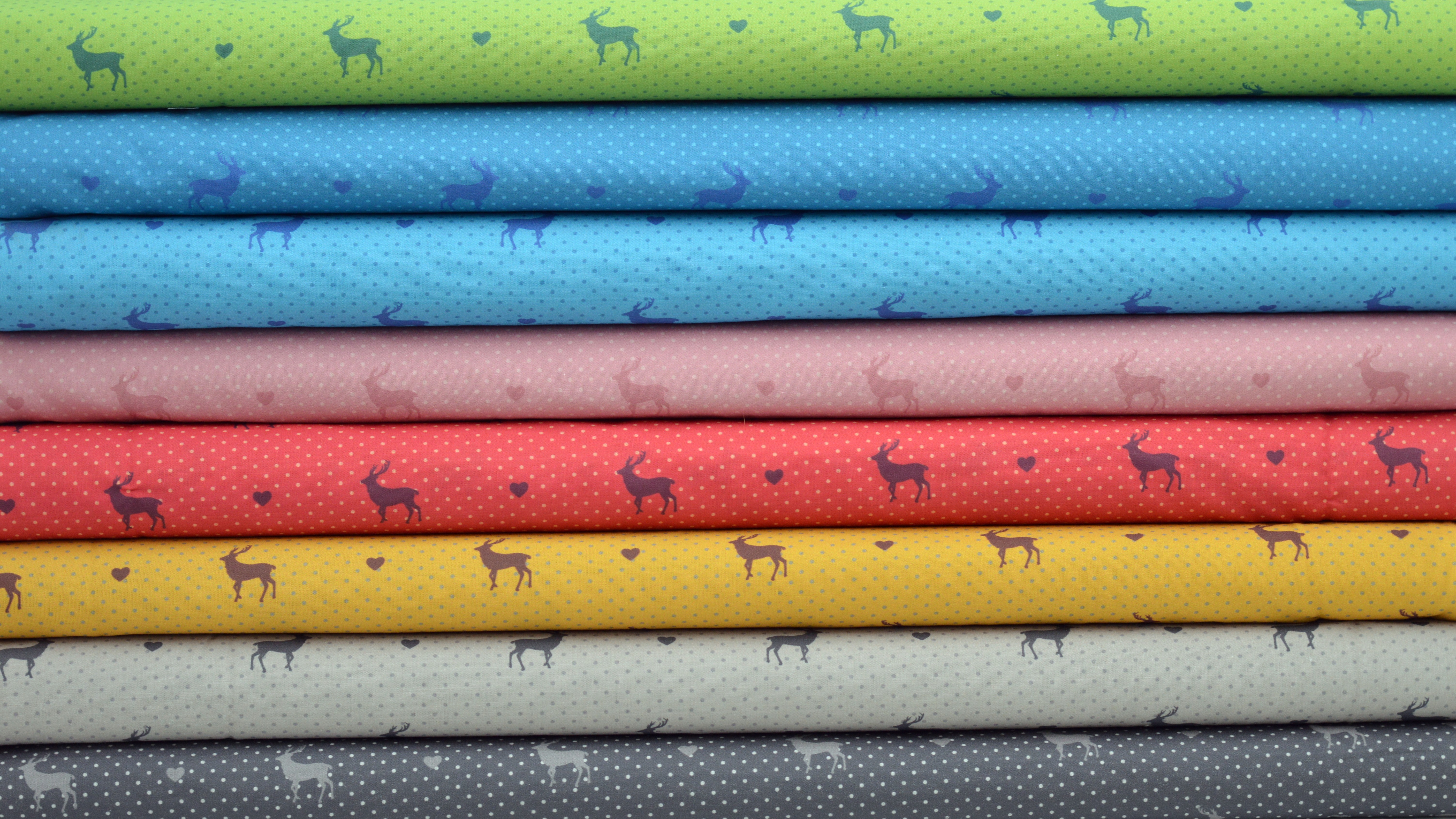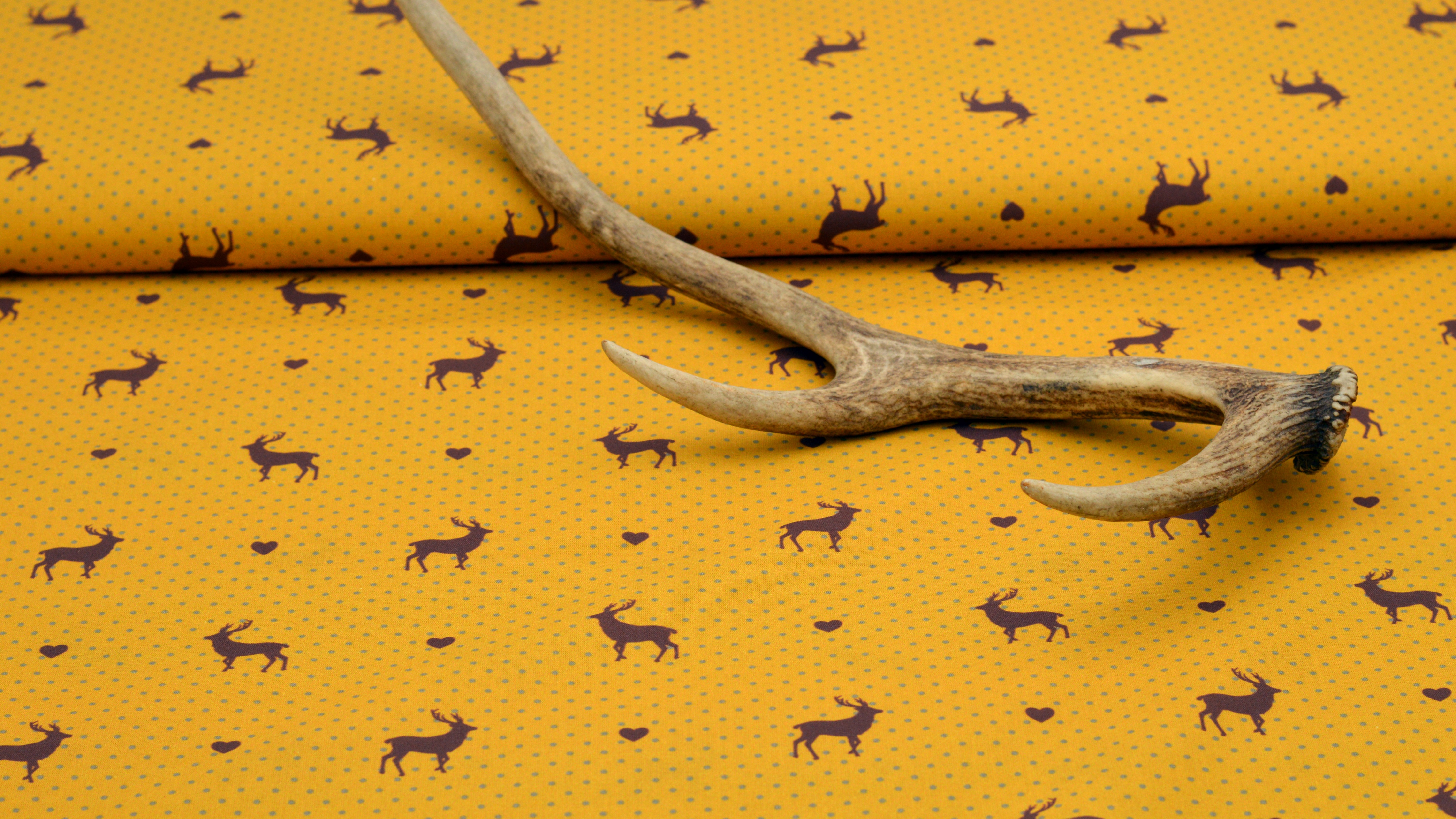 Dieser schöne Hirschstoff mit Herzen ist ein toller Baumwollstoff aus unserer Schwarzwald-Eigenproduktion! Moderner Landhausstil mit Herz (aber nicht zuviel!) für eure Nähzaubereien - erhältlich in 8 Farben!