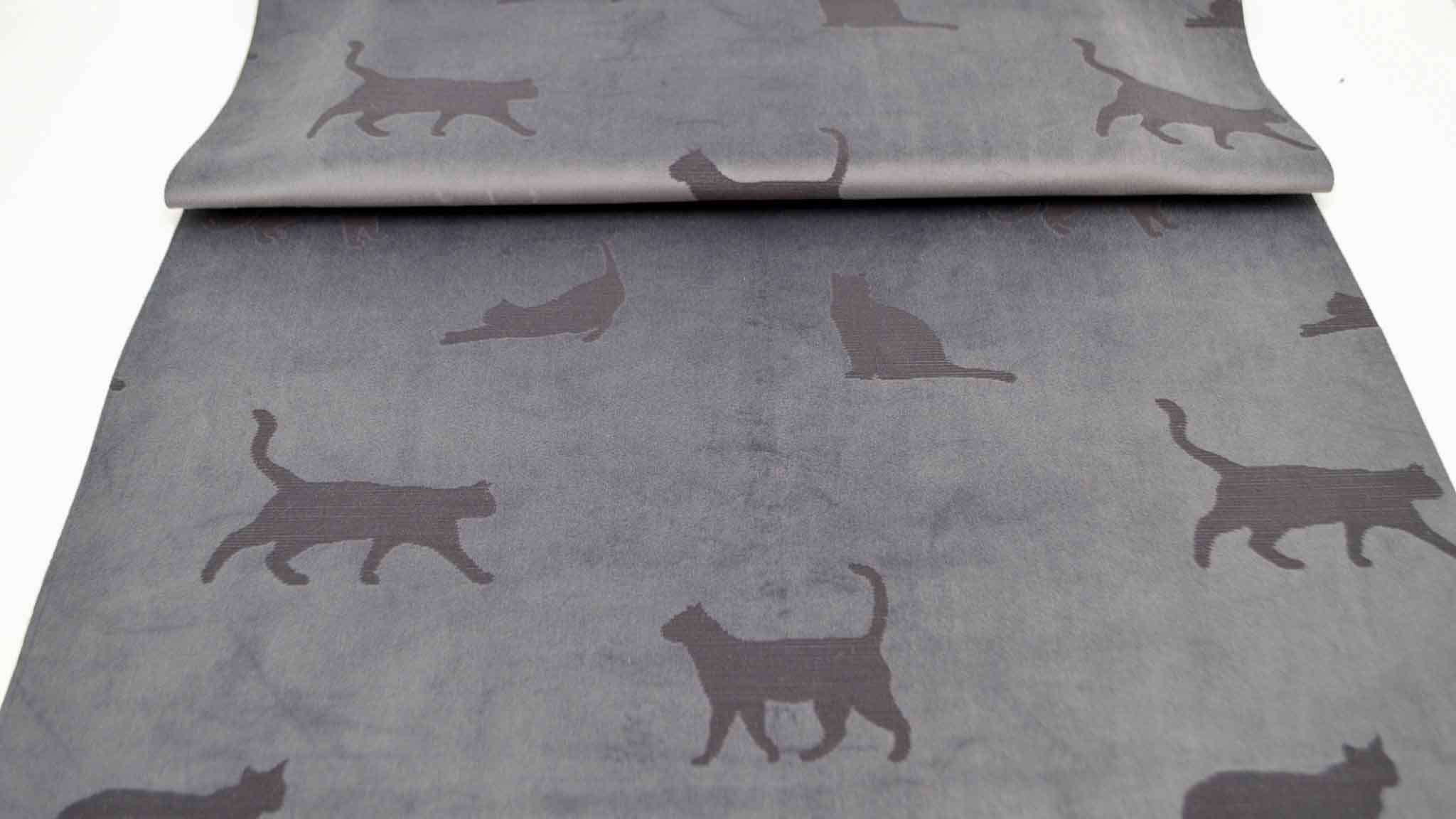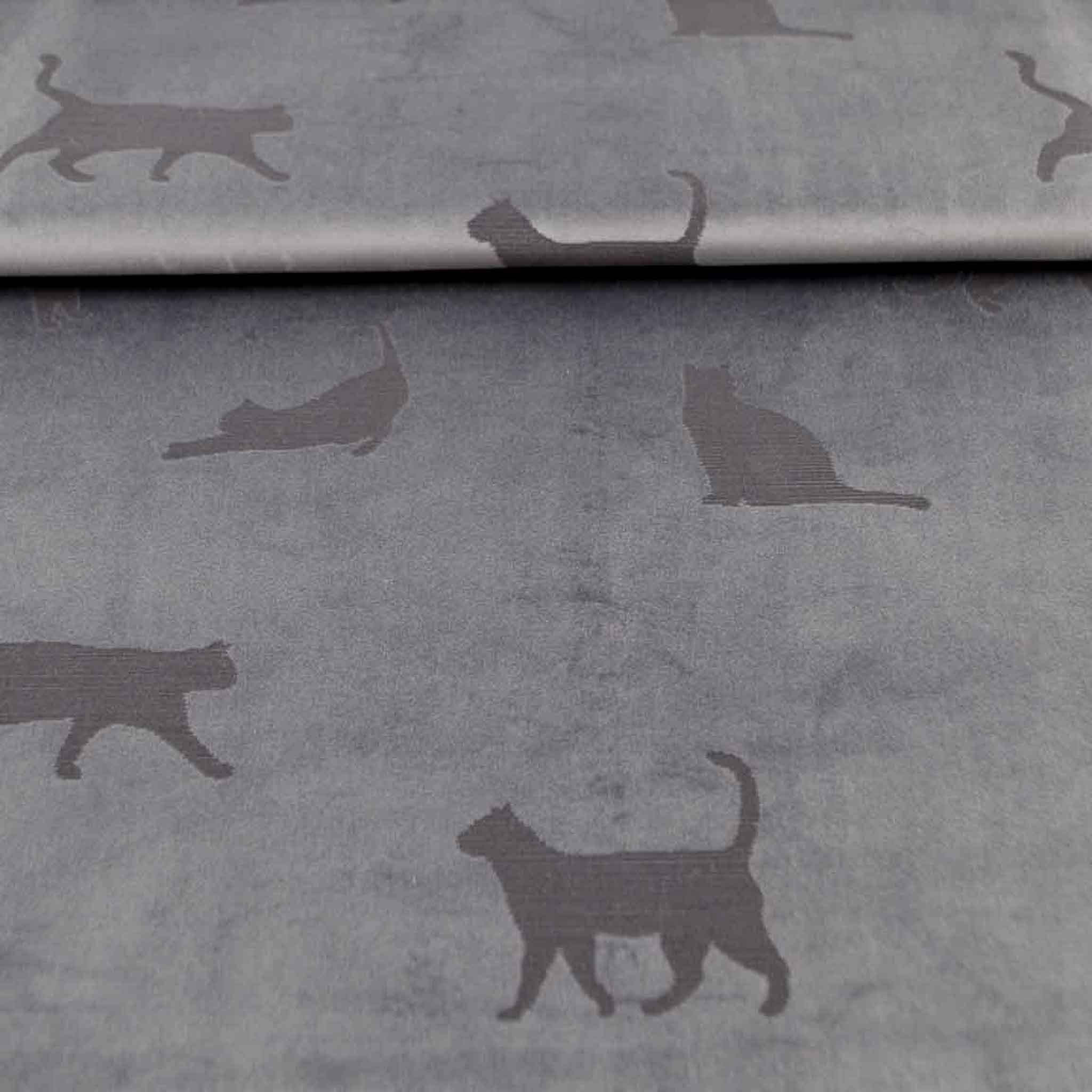 Muster: Katzensilhouetten in den Stoff gelasert, in verschiedenen typischen Positionen